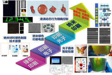 基于纳米材料制备及功能墨滴图案化的基础科学问题,通过研究纳米材料构建浸润性差异的材料表面,发展了系统的绿色印刷技术[1];深入研究了印刷技术基本单元“点、线、面、体”精细控制的关键科学技术问题,实现了纳米材料的可控印刷与器件组装和光电功能器件的印刷制备[2]。基于聚合物乳胶纳米颗粒的大规模制备与自组装精细控制,发展了纳米颗粒自组装光子晶体涂层材料,利用光子晶体结构色取代传统颜料、染料,以非金属材料实现金属色制备。同时,将绿色纳米印刷技术应用于功能性聚合物光子晶体的图案化制备,并发展了一系列高性能的光学传感和检测器件[3]。推动光子晶体在高效发光、高灵敏光学检测等基础研究与应用领域取得突破。